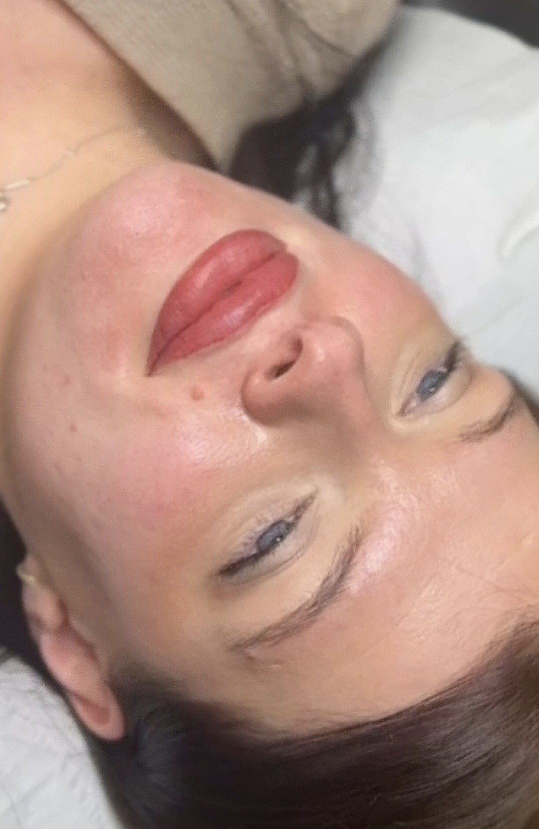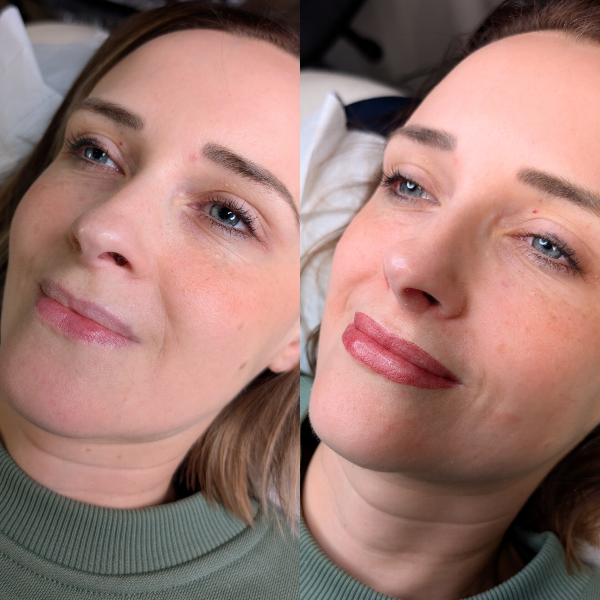 Lips may appear brighter and slightly swollen immediately after treatment. Light flaking can occur, and the colour will soften by up to 40–60% as healing completes over 4–6 weeks.